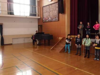 体育館で,舞台練習をしていました。元気な声で歌を歌っていました。