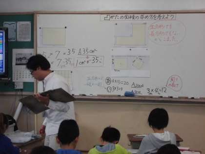 算数の時間に,「面積」を学習しています。今日は,Lがたの面積の求め方を考えていました。