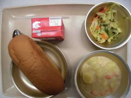 今日の給食の献立は,「黒糖コッペパン」「じゃがいものクリームシチュー」「アスパラガスのソテー」「牛乳」です。