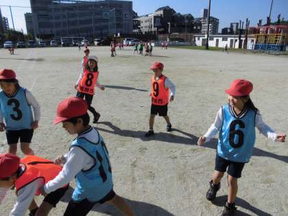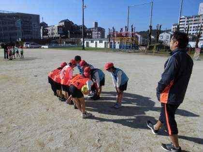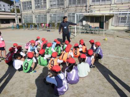 体育の時間に,「パスボール」を学習しています。今日は,「パスをつなぐ」ことをめあてにゲームをしていました。