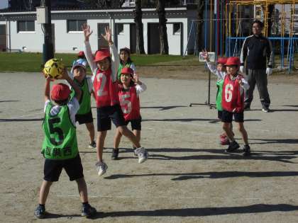 体育の時間に「パスボール」を学習しています。今日は,パス回しに気をつけながらゲームをしていました。