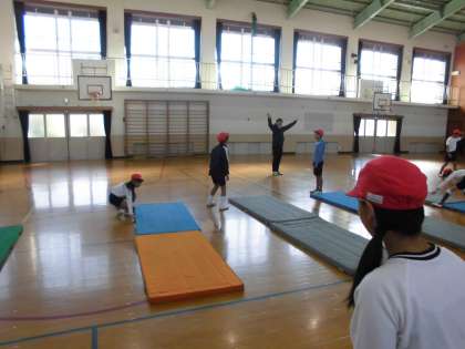 体育の時間に,「マット運動」を学習しています。今日は,今までに練習してきた技と新しい技を練習していました。