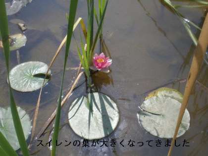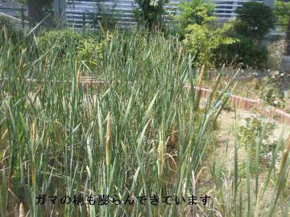 スイレンの葉も直径30センチぐらいになり,きれいな花も咲いています。またガマの穂もたくさんつきました。まだ緑いろですが,これからきれいな柔らかい茶色の穂に変化してきます。