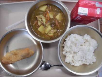 今日の給食の献立は,「麦ご飯」「カレーあんかけご飯の具」「春巻」「牛乳」です。