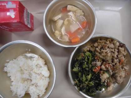 今日の給食の献立は,「玄米ご飯」「鶏飯の具」「小松菜の胡麻炒め」「かぶらとおあげのたいたん」「牛乳」です。