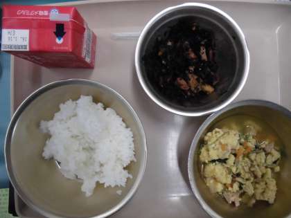 今日の給食の献立は,「ご飯」「親子煮」「ひじきのにつけ」「牛乳」です。