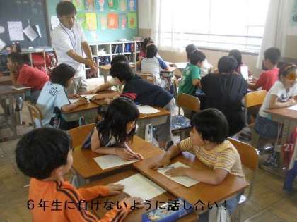 4年生の子どもたちは,いつになく目をきらきら輝かせ,6年生の話し合い活動に魅了されていました。そして,早速,真似をして話し合い活動に入りました。