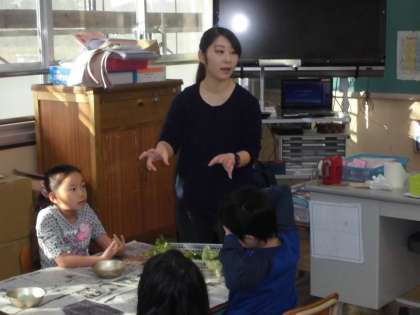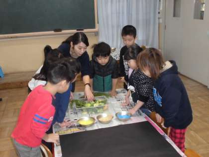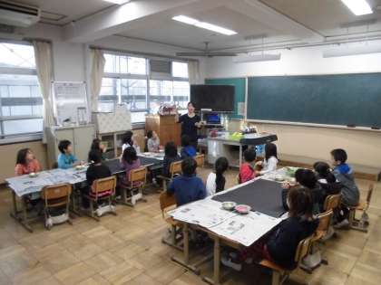 図画工作の時間に「ぺたぺたぺったん」を学習しています。今日は,野菜を使ったスタンプで絵を描いていました。
