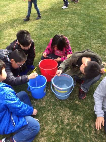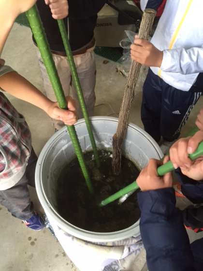 野外活動クラブで藍染の染液を作りました。学校で収穫した藍の葉を発酵させ、石灰や小麦粉・グラニュー糖などを入れてお湯を足しながら作ります。きつい匂いの中、みんなで混ぜ、仕込みができました。来月まで毎日混ぜつづけ、藍染の染液が完成します。染めるのが楽しみです。