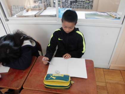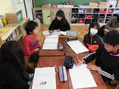 国語の時間に「分かりやすく伝える」を学習しいます。今日は,1年生にも伝わりやすい文を考えていました。