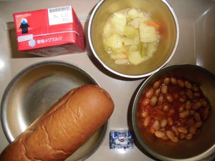 今日の給食の献立は,「黒糖コッペパン」「大豆と鶏肉のトマト煮」「野菜のソティ—」「かくチーズ」「牛乳」です。