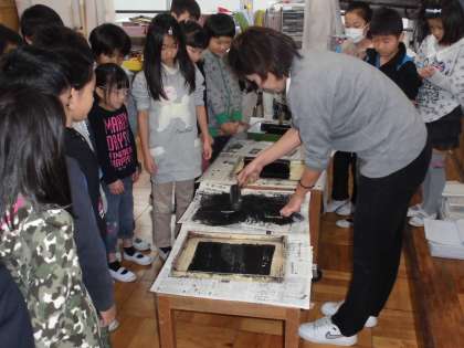 図画工作の時間に,「版画」を学習しています。今日は,版画を刷っていました。
