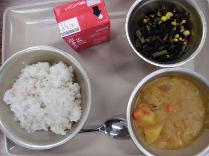 今日の給食の献立は,「麦ご飯」「チキンカレー」「ひじきのソテー」「牛乳」です。