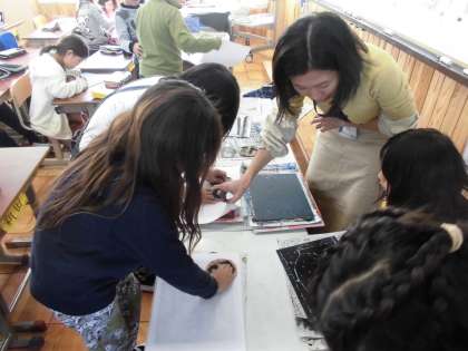 今日はこれまで作成してきた版画の仕上げをしました。一生懸命掘ってきた板にインクをのばし,和紙に刷り上げた作品を見ると・・・