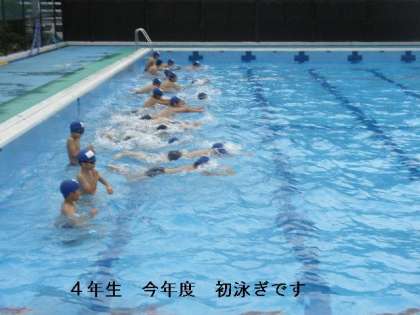プール学習がはじまりました。今日は初泳ぎでした。プール学習の約束を確認したあと,けのびからバタ足の練習をしました。4年生には,水が苦手な子どもたちが数人いるようです。今年は全員が泳げるようにがんばりたいと思います。