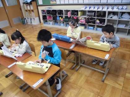 音楽の時間に,「子犬のマーチ」を学習しています。今日は,けんばんハーモニカで演奏練習をしていました。