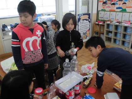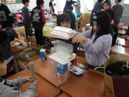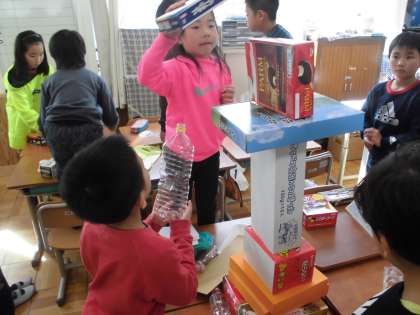 生活科の時間に,「あそんでためしてくふうして」を学習しています。今日は,身の回りにある廃材を使って高さ比べをしていました。