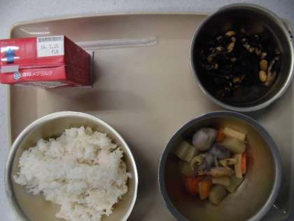 今日の給食の献立は,「麦ご飯」「鶏肉と里芋の煮つけ」「ひじきまめ」「牛乳」です。