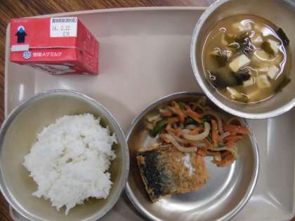 今日の給食の献立は,「ご飯」「味噌汁」「鯖の竜田揚げ」「野菜のきんぴら」「牛乳」です。