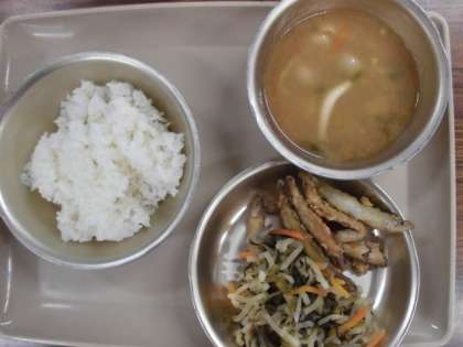 今日の給食の献立は,「ご飯」「いものこ汁」「すぐきと大根のごまめ炒め」「わかさぎのこはく上げ」です。