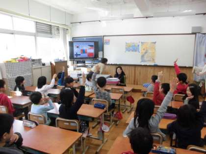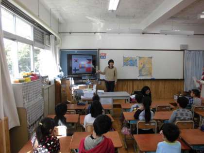 2年生の教室で,多文化授業を行っています。今日は,フィランドの言葉や民族衣装について学習していました。