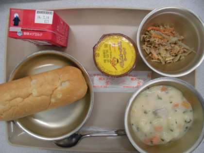 今日の給食の献立は,「おさつパン」「じゃがいものクリームシチュー」「ごぼうのソテー」「プリン」「牛乳」です。