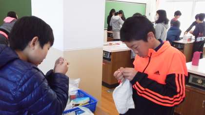 慣れた手つきで,エプロンを次々と修繕していきました。