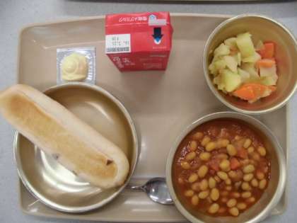 今日の給食の献立は,「おさつパン」「ポークビーンズ」「野菜のホットマリネ」「かたチーズ」「牛乳」です。