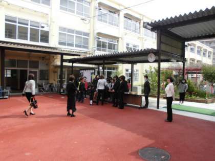 入学式の受付が,始まりました。元気に1年生が,登校しています。