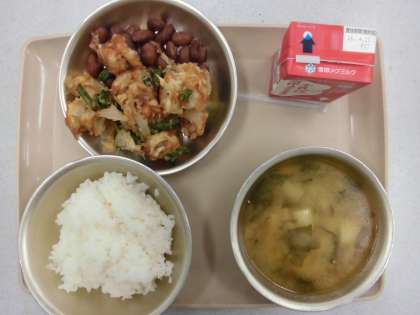 今日の給食の献立は,「ご飯」「かきあげ」「牛乳」「金時豆の甘煮」「みそ汁」です。