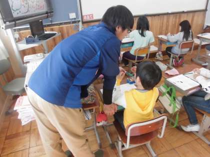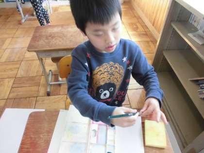 図画工作の時間に,「色・形・いいかんじ!」を学習しています。今日は,いろいろな色を混ぜて画用紙に線を描いていました。
