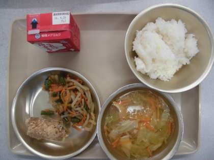今日の給食の献立は,「胚芽米ご飯」「キャベツの吉野汁」「牛乳」「サバの竜田揚げ」「野菜のきんぴら」です。