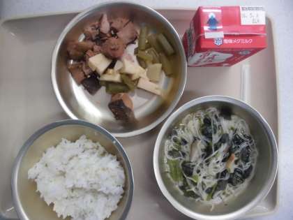今日の給食の献立は,「麦ご飯」「にゅうめん」「牛乳」「なまぶしとふきの煮つけ」です。