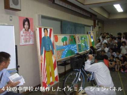雨のためにペットボトル灯ろうは,支所の地下駐車場で縮小されて点灯されましたが,その灯りを見ていると,醍醐10校の小学校4校の中学校が一つになって取り組めた行事だったと思います。