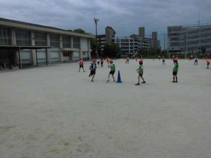 体育の時間に,「リレー」の学習をしています。今日は,班対抗のリレー大会をしていました。