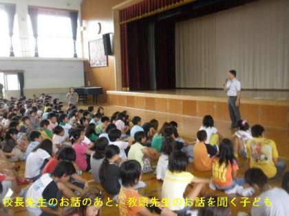 7月に入っての朝会がありました。いつものように校長先生から2つのお話がありました。子どもたちは「聞き方名人」を目指して,校長先生をしっかり見て話を聞いていました。