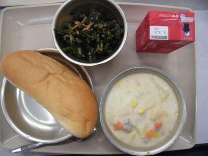 今日の給食の献立は,「ミルクコッペパン」「コーンのクリームシチュー」「牛乳」「ツナとほうれん草のソティー」です。