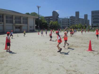 リレーはバトンの受け渡しがとても重要です。今日はチームに分かれてバトンの受け渡しの練習をしました。