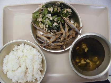 今日の給食の献立は,「麦ご飯」「若竹汁」「きびなごの琥珀揚げ」「小松菜と湯葉の煮びたし」です。