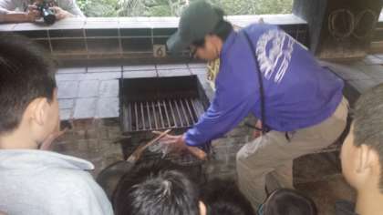 うまく火をおこす方法を,山の家の職員さんに教わっています。