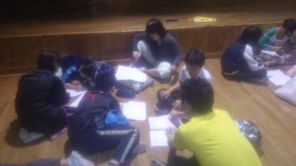 ホールでバーチャル映像を観た後は,班別ミーティングで今日の振り返りをしました。1日目のモットーであった「協力」みんなでできたかな?