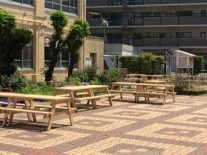 すっきりした中庭に,きれいにペンキを塗り直された机が並びます。