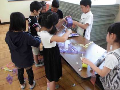新聞紙を丸めたり破いたりして,考えたものや思いついたものを,体いっぱい使って表現しています。