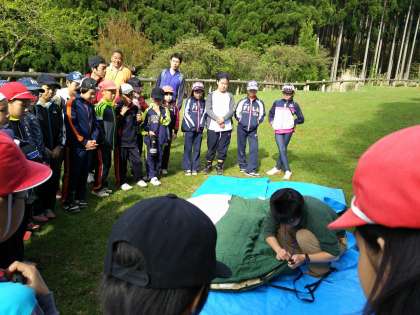 テントの設営や寝袋の使い方について,山の家の職員さんのお話をしっかりと聞いています。