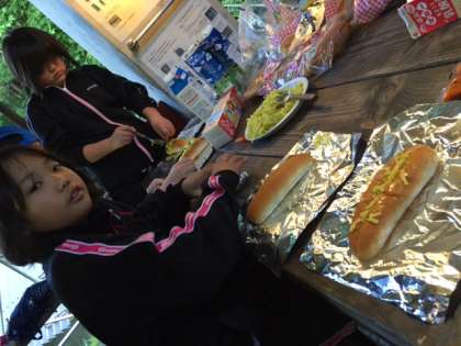 朝食は,炊飯場でパックドックを作っています。