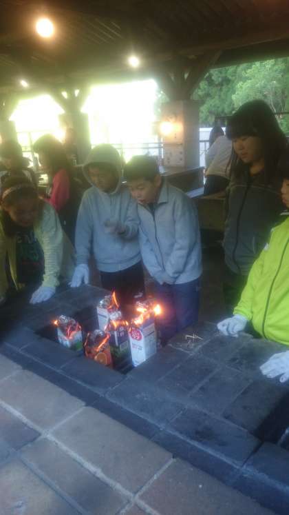 具をパンにはさんだら,焦げないようにアルミホイルで丁寧に包んで,牛乳パックに入れます。牛乳パックに火をつけて,パックが燃え尽きる頃にはアツアツのホットドックの出来上がり!!