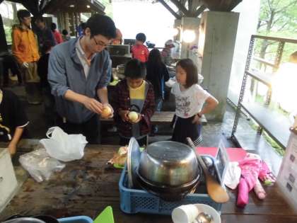 初日は,野外炊事を行いました。メニューは,カレーライスです。写真は,野菜や肉等の下準備をしています。