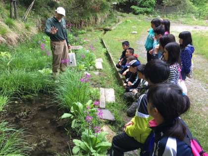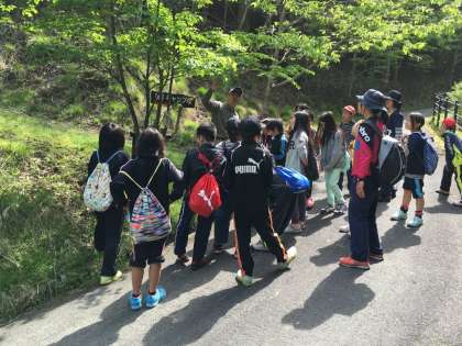 自然観察!2つのグループに分かれて、山の家の植物や生き物について教えてもらっています。