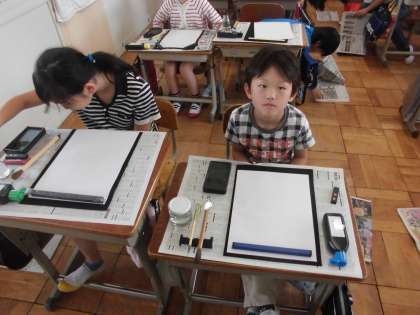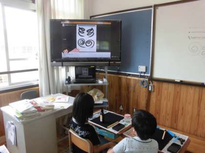 書写の学習が始まりました。今日は,筆を使っていろいろな線を書いていました。