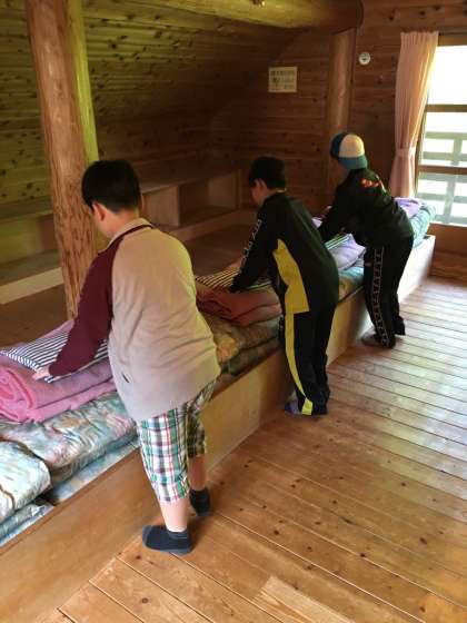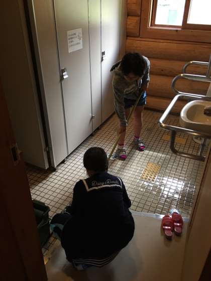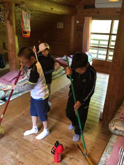 楽しく過ごしたロッジとも,今日でおわかれです。みんなで手分けをしてきれいにお掃除をしています。!